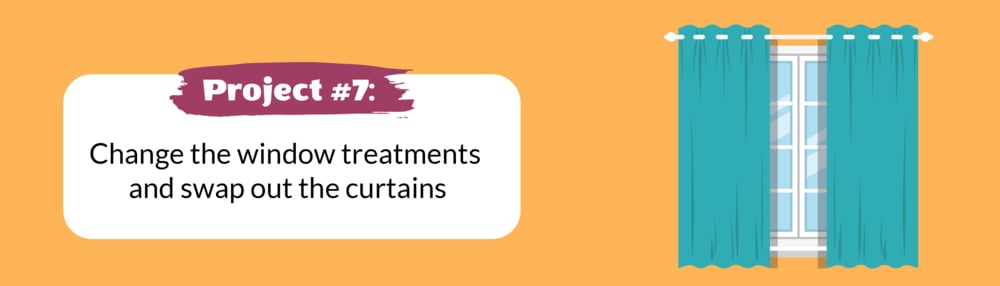 The combination of new window treatments and new curtains can go a long way in giving a pretty facelift in a room. Trade your shabby window treatments for some new panels that you can DIY or purchase, then opt for flowy curtains that will not only block out the sun but will also give a boost of color to your home. If you're feeling fancy and want to add more visual interest into your window, use dark-toned curtain rods with decorative caps.